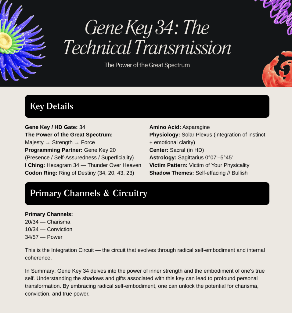 Gene Key 34 is where raw power meets consciousness, where instinct becomes embodiment, and where the “beast” within your nature learns to move with grace instead of urgency.